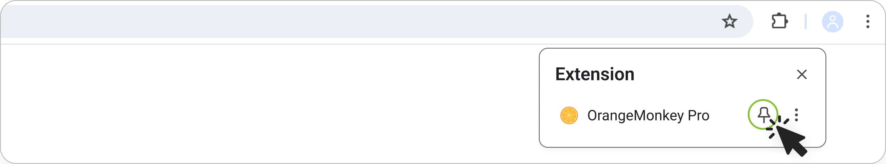 Click the puzzle icon located at the top-right corner of the browser. In the dropdown menu, click the pin icon next to the OrangeMonkey extension. This will keep OrangeMonkey readily accessible.