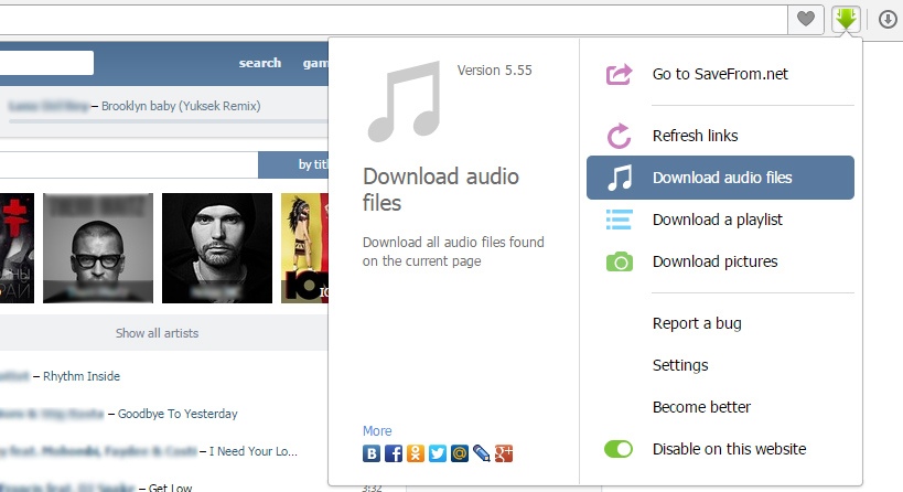 To download all music tracks from a specific page, open the SaveFrom.net helper menu and select "Download all mp3 files".